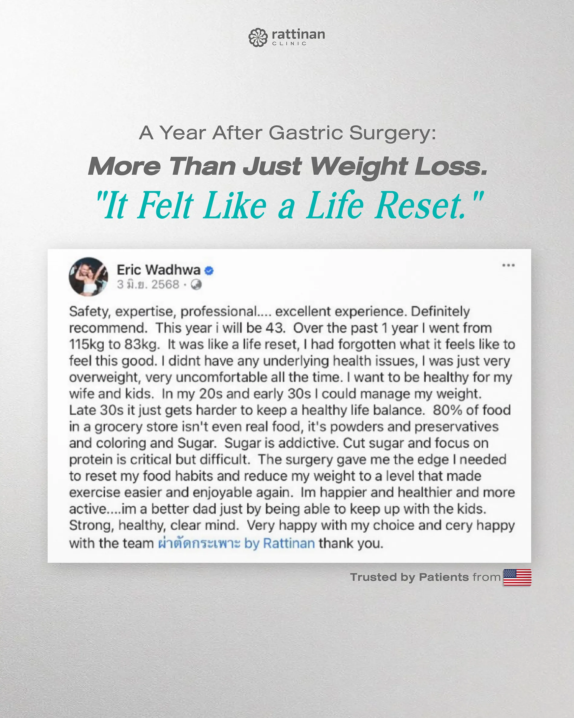 Just had my gastric sleeve done 3 weeks ago, Rattinan top class clinic.. From the second we talked to into after care now it's been second to none.. Highly recommend this clinic for bariatric procedures and big thanks to the clinic staff and of course Dr panot and Dr suthipong best in the business. Well on my weight loss journey and feeling good!