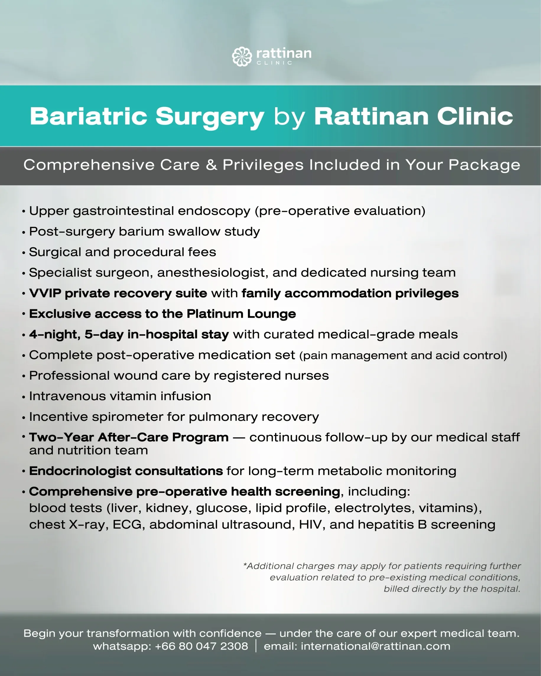 At Rattinan Clinic, the procedure starts at 12,694 USD, which includes a comprehensive health check, at least 4 nights in a recovery room, a customized meal plan, and access to ongoing support through a private chat for up to 2 years.