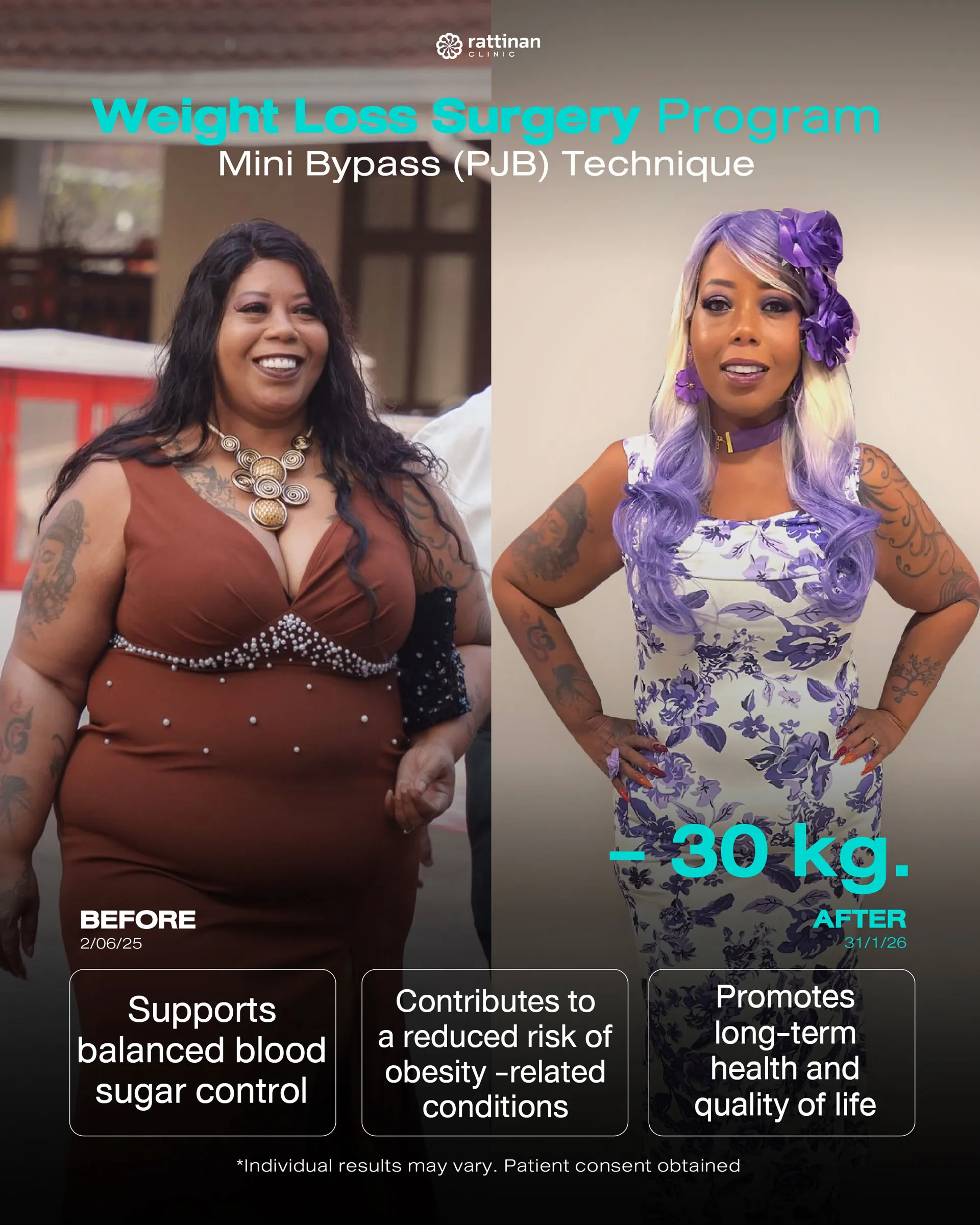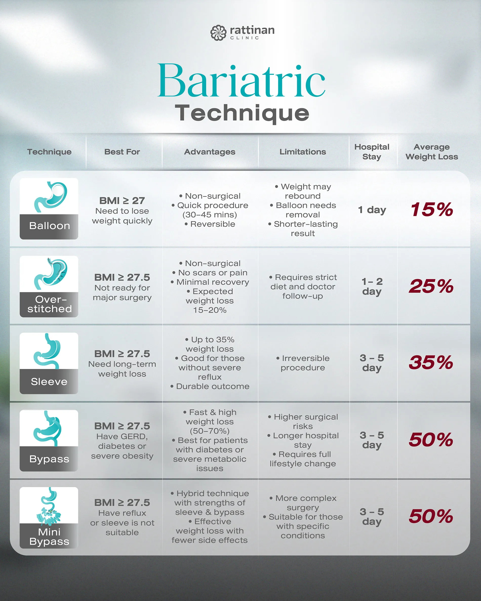 As your trusted healthcare partner, our team of expert surgeons here at Rattinan Clinic ensures the highest level of safety for all bariatric procedures. If you are considering weight loss surgery and unsure which method is best for you, we recommend consulting with our specialists to determine the most suitable and safe option tailored to your health needs.