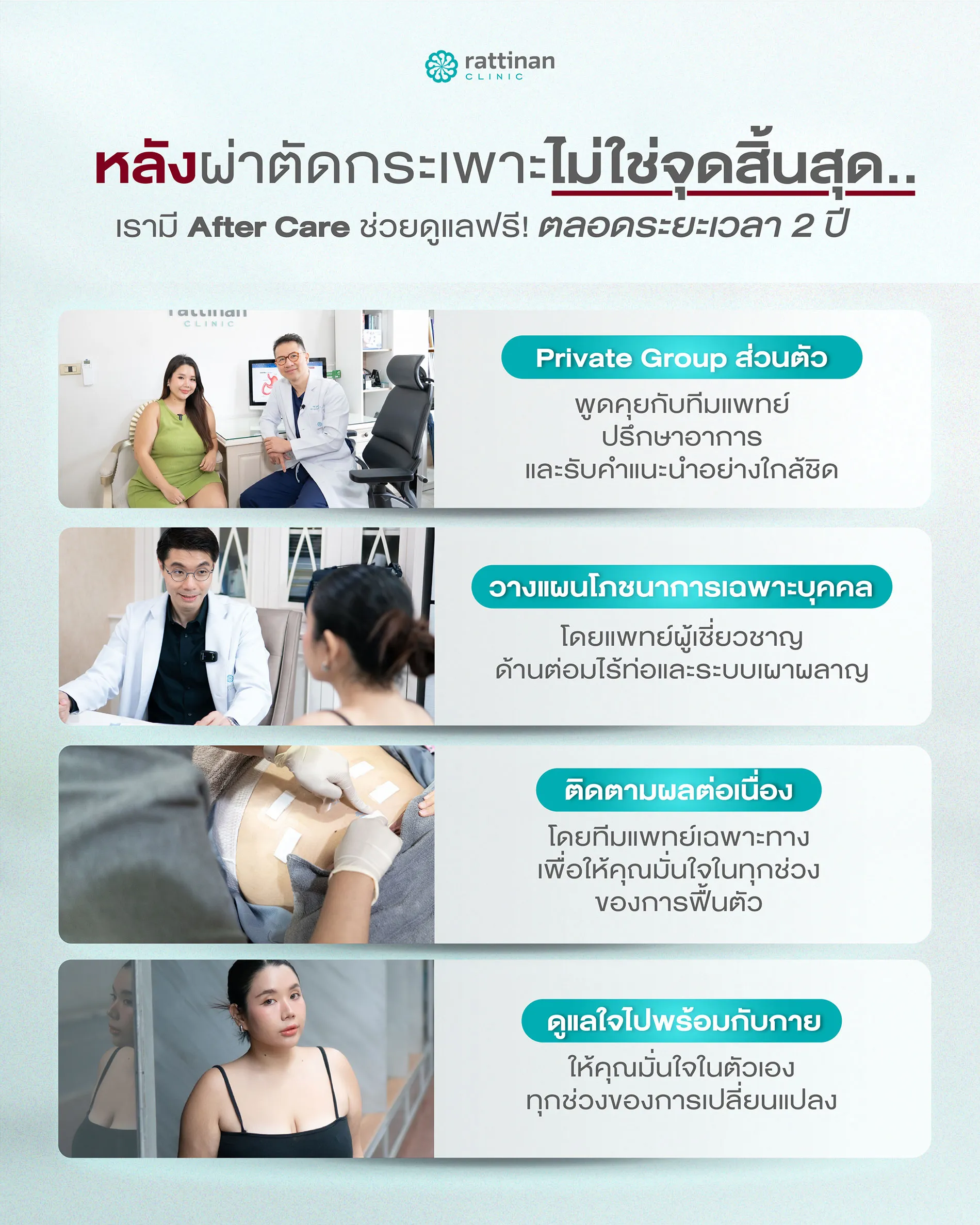 ที่รัตตินันท์ คลินิก เรามีแผนการดูแลต่อเนื่อง 2 ปีเต็ม โดยทีมสหสาขาวิชาชีพ ครอบคลุมการดูแลทั้งร่างกายและจิตใจอย่างครบถ้วน