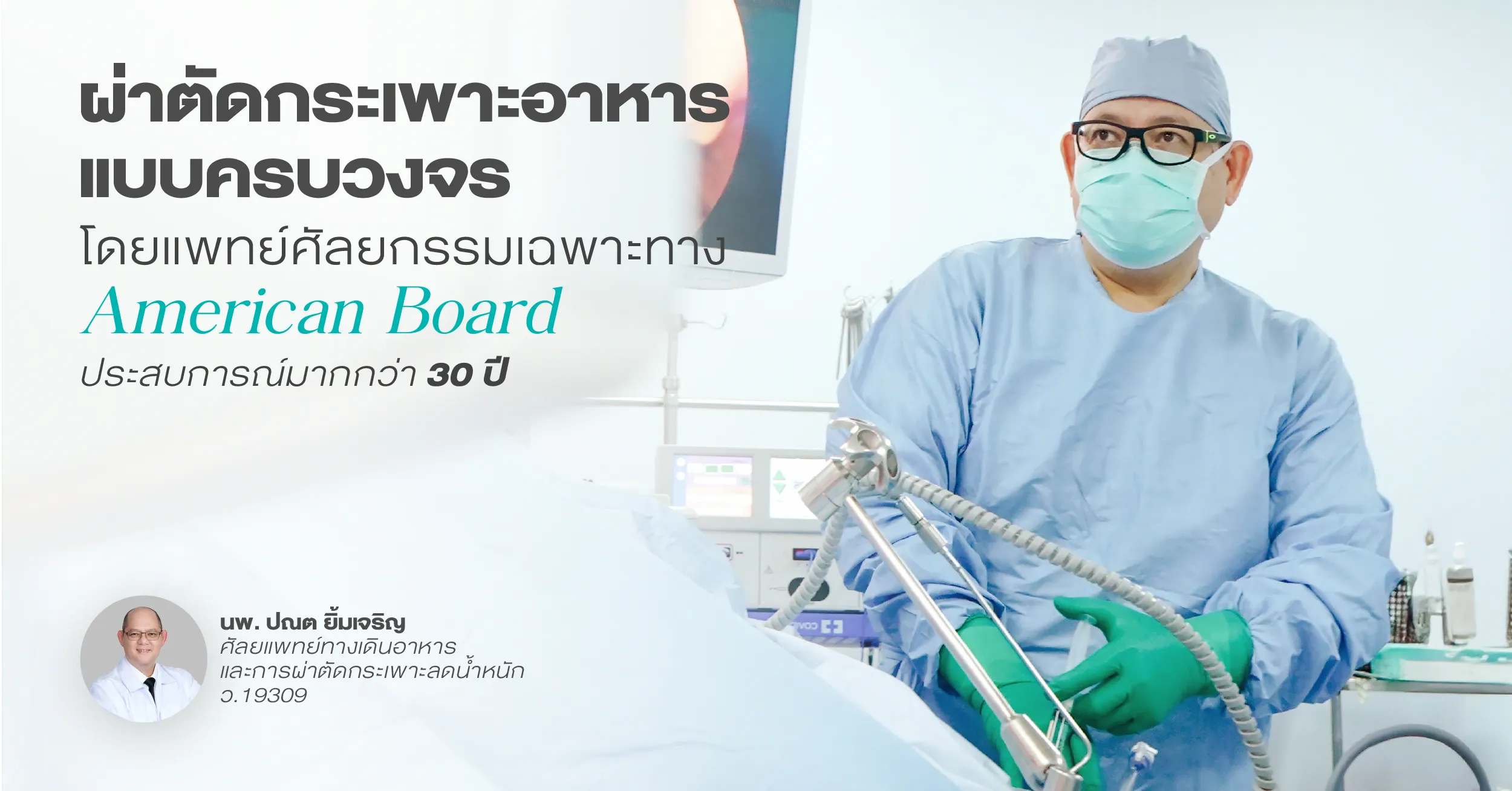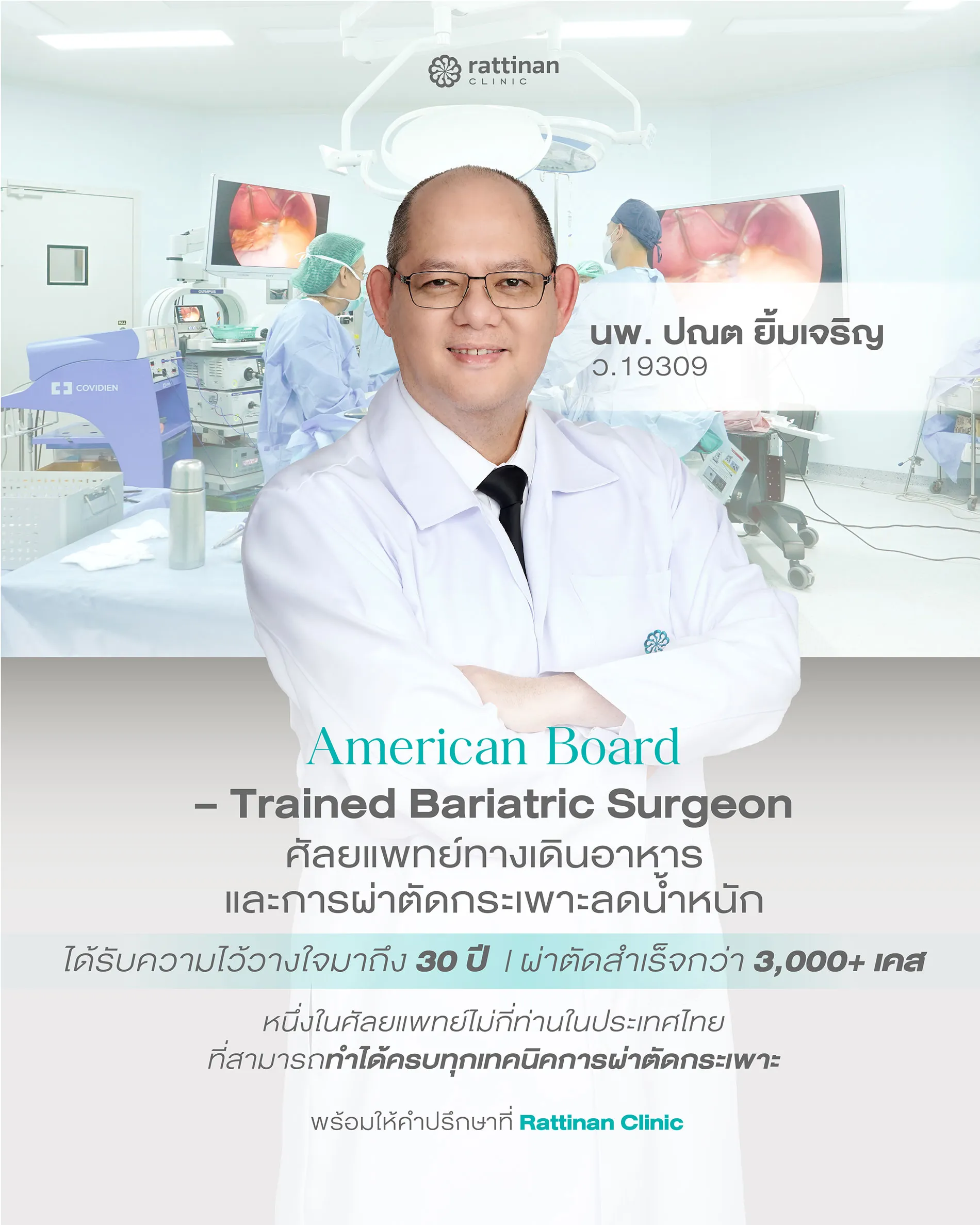 - ทีมแพทย์เฉพาะทาง นำโดย นพ. ปณต ยิ้มเจริญ (จบ American Board และ ดูแลผู้ป่วย Bariatric Surgery มาตั้งแต่ปี 2537)